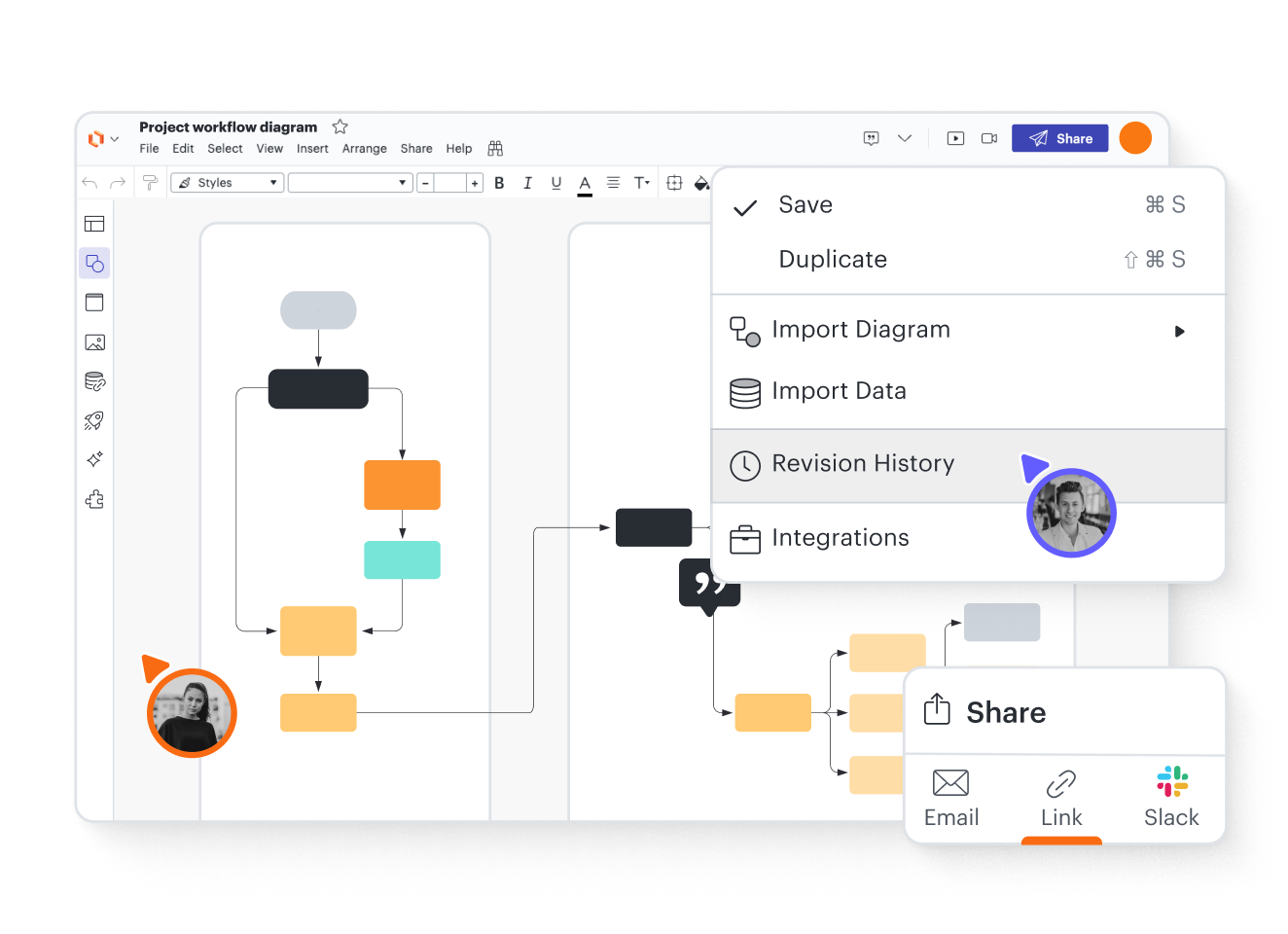Make teamwork simple. Work together on a process diagram and use commenting, sharing, and revision history features to keep everyone on the same page.
