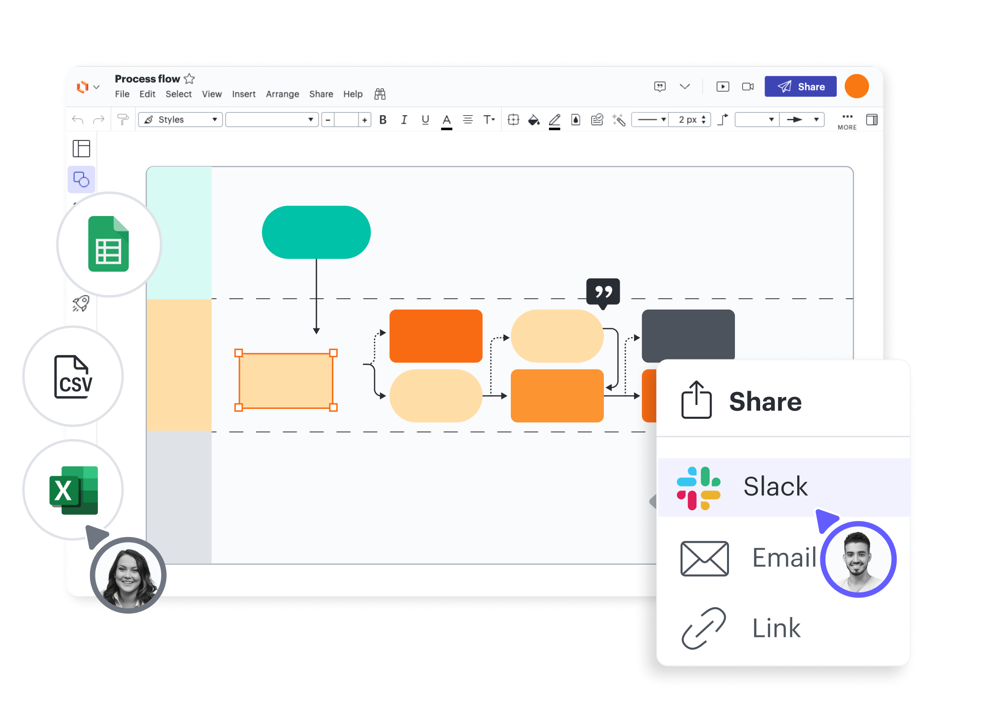 Integrate Lucidchart with Microsoft Word, Excel and PowerPoint to insert powerful visuals into your data sets. Add mind maps, flowcharts, and other diagrams to break up text-heavy documents and bring clarity to your process flows. Lucidchart also integrates seamlessly with Microsoft Teams, allowing you to conveniently share, collaborate on, and even edit your diagrams directly in team channels.