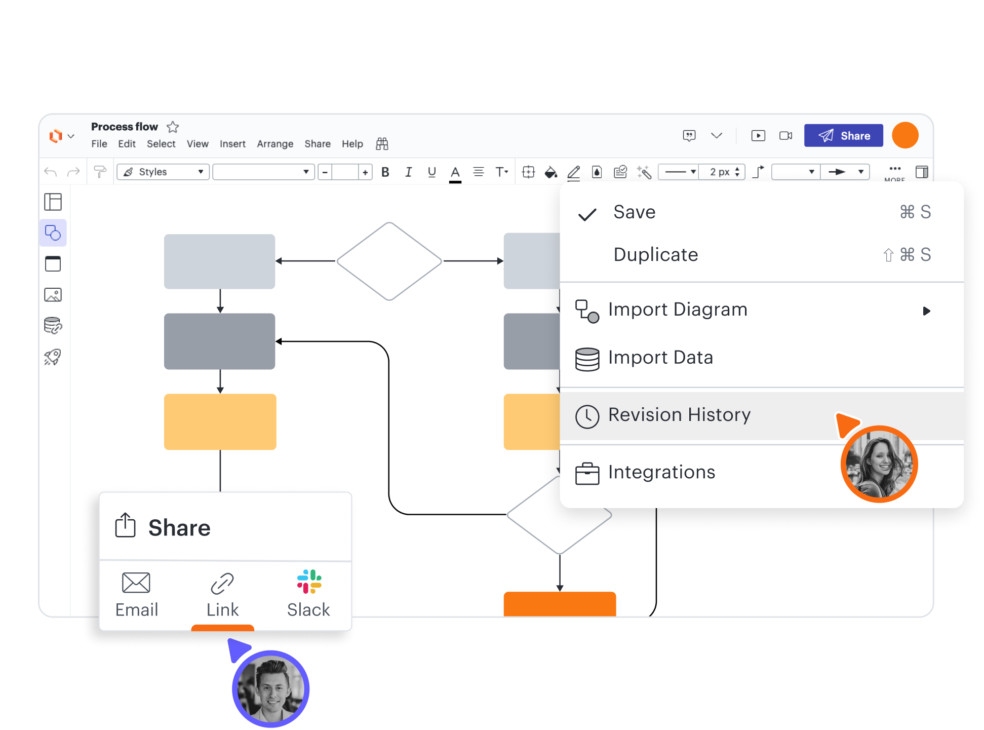 No more sending the same Visio file back and forth between collaborators. Lucidchart lets you work with your team in the same canvas simultaneously, no matter where you’re located. Our cloud-based platform has collaboration built right in, making it easy to email, embed, and present your diagrams instantly.