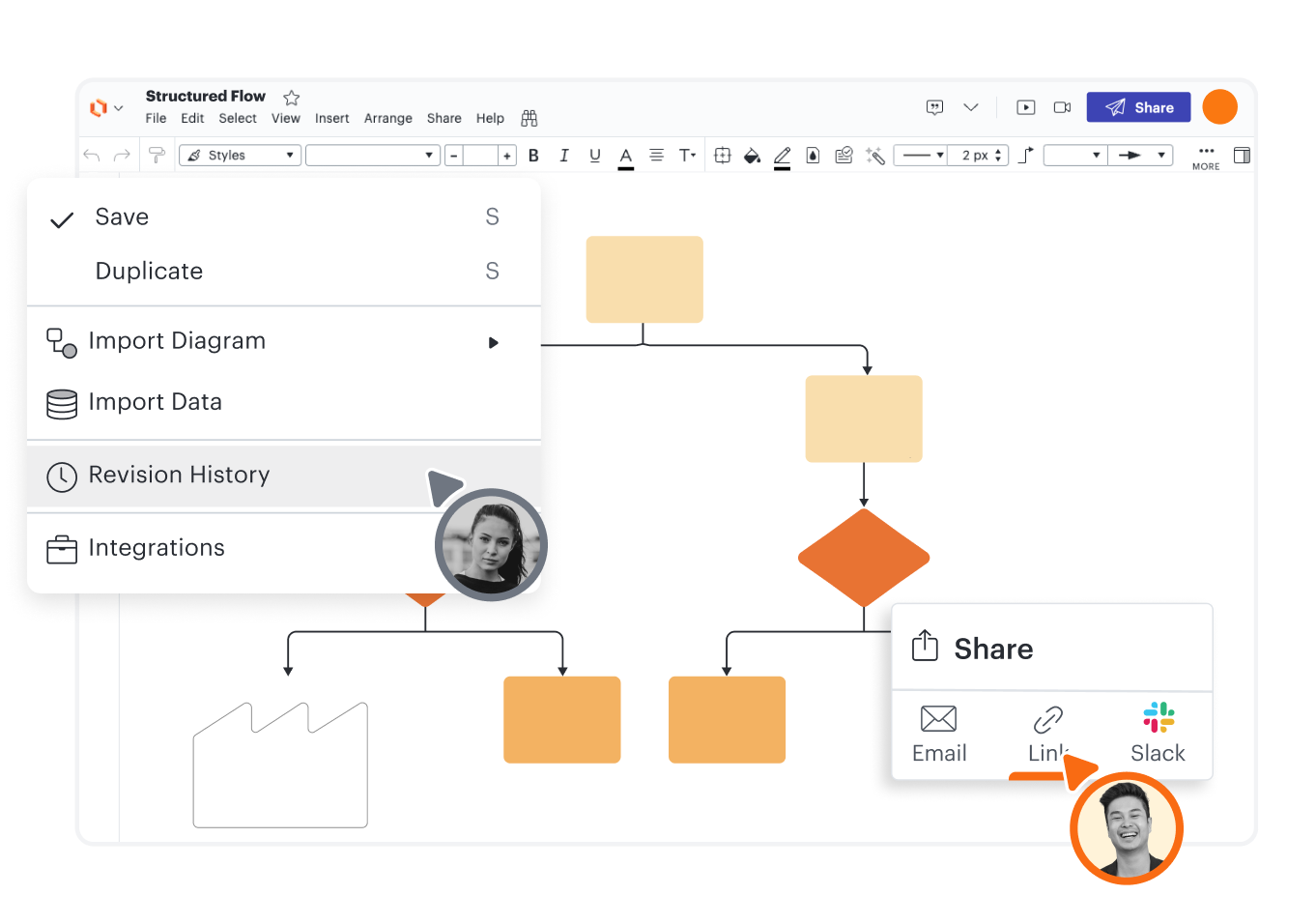 Lucidchart helps you outline and standardize processes. Link data to your workflows and add conditional formatting to discover bottlenecks and track progress at a glance.