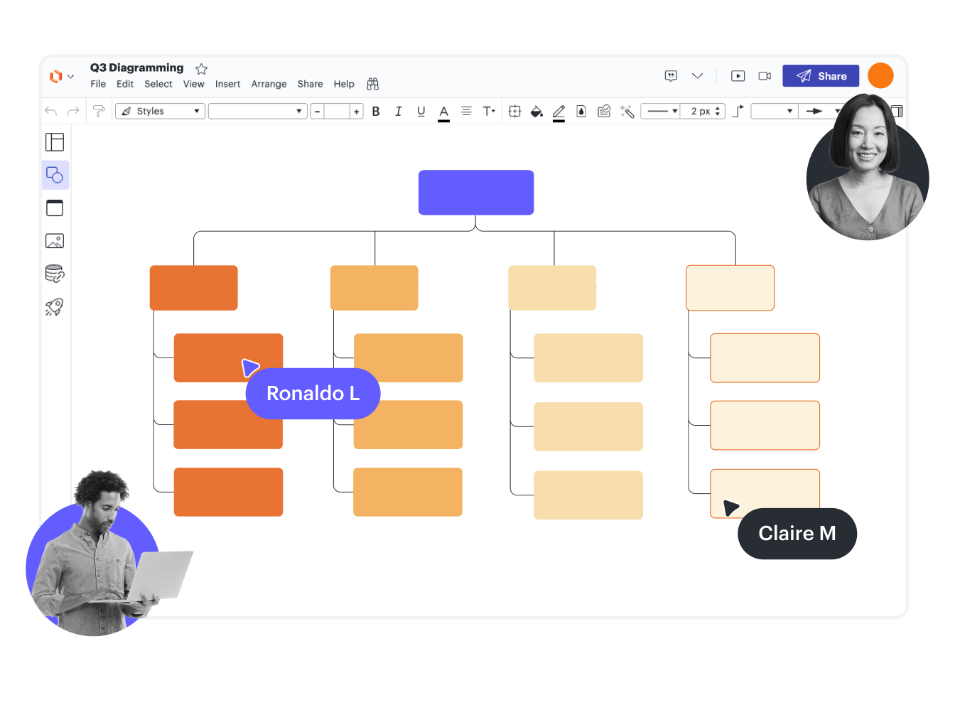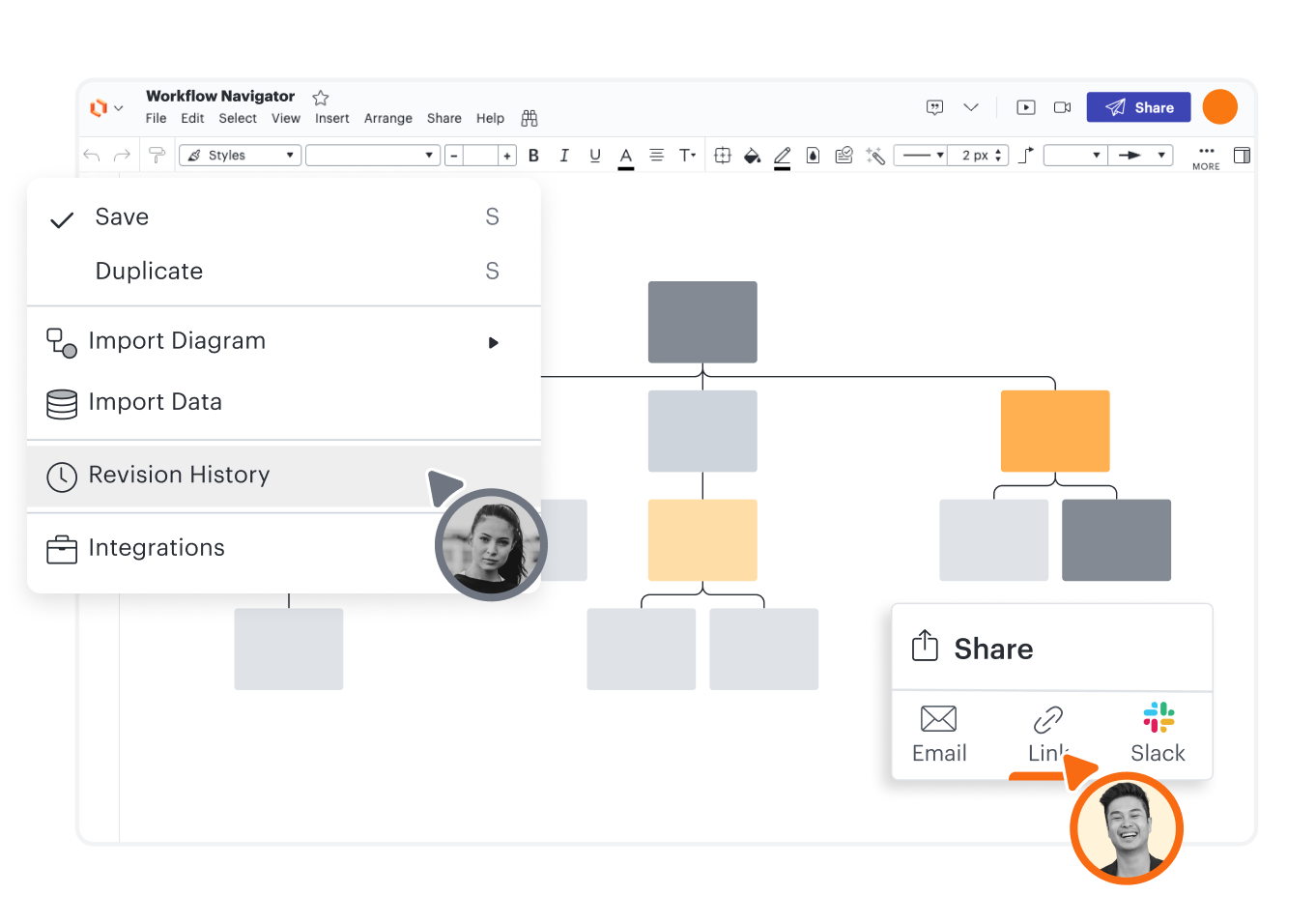Make teamwork simple. User tiles show who is actively working in a diagram, and commenting, sharing, and revision history features keep everyone on the same page.