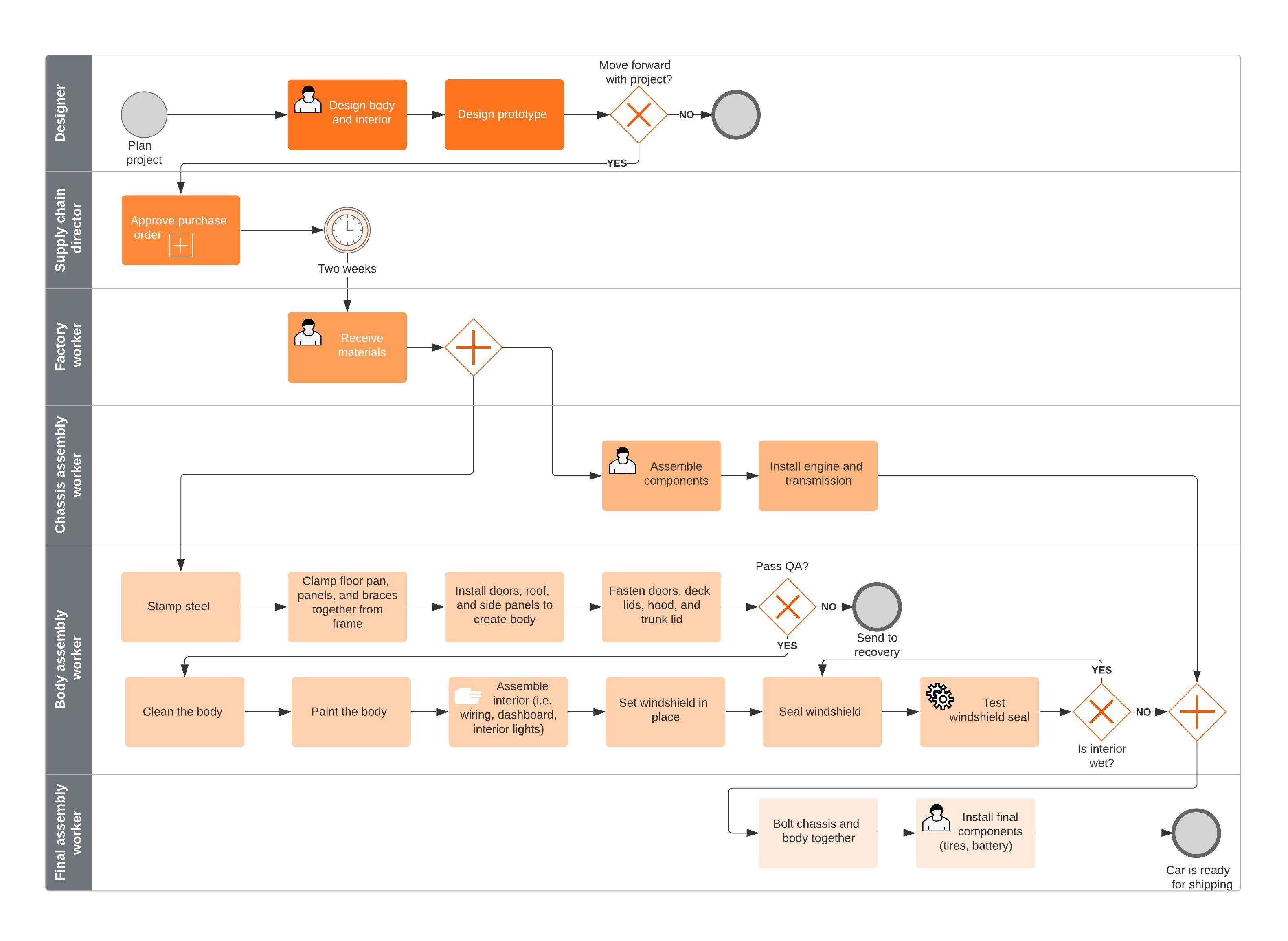 Elk element in een proceskaart wordt weergegeven door een specifiek stroomdiagram symbool. Vervolgens kun je met Lucidchart in je proceskaart vormen aanmaken en verplaatsen, labels en opmerkingen toevoegen en zelfs kiezen voor een aangepaste stijl.