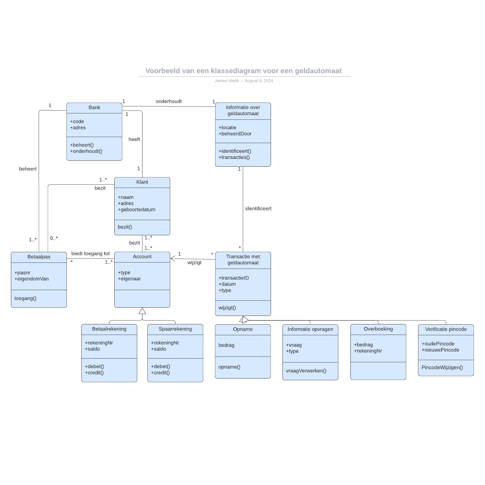 Overname: bij dit proces neemt een onderliggende of subklasse de functionaliteit van een bovenliggende of superklasse over, ook gekend als generalisatie Dit wordt gesymboliseerd door een rechte verbonden lijn met een gesloten pijl die in de richting van de superklasse wijst.