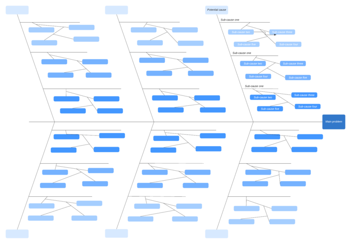 Een visgraatdiagram wordt ook wel een ishikawa diagram of oorzaak-en-gevolgdiagram genoemd. Dit diagram beschrijft namelijk de potentiële oorzaken van een probleem of resultaat. Het diagram lijkt op een echte visgraat, met in het midden een lange lijn die wijst naar het belangrijkste resultaat, ook wel de 'probleemstelling'. De andere graten vertakken zich vanaf de middelste graat en staan voor verschillende categorieën van oorzaken. In de onderstaande sjabloon hebben we de zes standaardcategorieën weergegeven: metingen, materialen, mensen, machines, methodes en milieu. Als er andere categorieën zijn die beter bij jouw probleem passen, kun je deze natuurlijk altijd aanpassen.