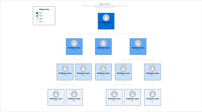 Struktura organizacyjna odwzorowuje strukturę firmy. W diagramie każda osoba jest reprezentowana przez jedno pole, a poszczególne pola są połączone liniami. Zasadniczo linie pionowe informują, że osoba powyżej jest zwierzchnikiem osoby poniżej, a linie poziome informują, że członkowie zespołu są na tym samym poziomie. Przeglądając strukturę, można szybko zorientować się, kto i komu podlega, jakie są stanowiska poszczególnych osób oraz do jakich zespołów lub działów należą. Takie diagramy przydają się, gdy trzeba ustalić, z kim rozmawiać o konkretnym problemie oraz w przypadku restrukturyzacji zespołu w celu poprawy wydajności.