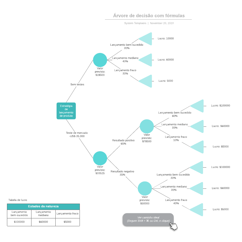 Nosso software de árvore de decisão online torna simples mapear os resultados potenciais de uma série de decisões, esclarecendo as opções, os riscos, os objetivos e os ganhos ou perdas potenciais. Para começar mais rápido, basta abrir um de nossos modelos de árvore de decisão.