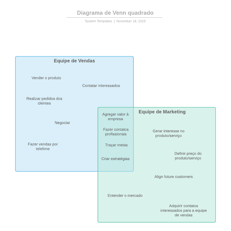 O Lucidchart oferece um modelo gratuito de diagrama de Venn com dois conjuntos que você pode usar para começar de forma rápida.