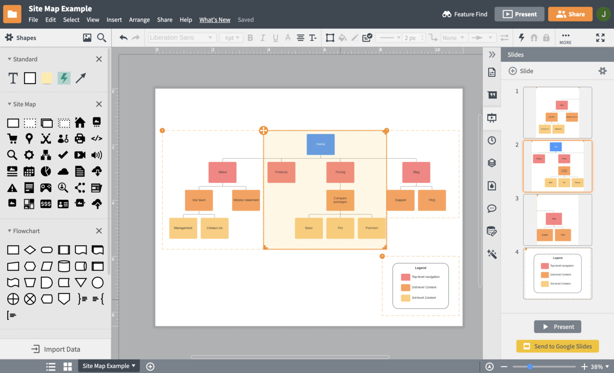 Abra a biblioteca de formas de sitemaps e arraste as formas para a tela de desenho; ou selecione um dos nossos exemplos de sitemap prontos para dar início ao seu diagrama.