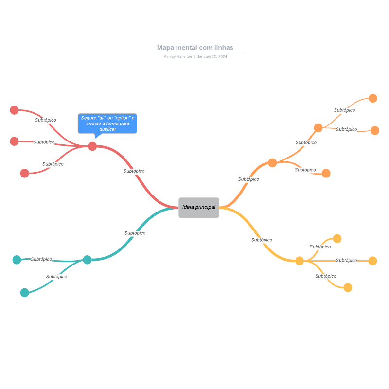 A ideia central representa o que você deseja discutir, como um problema que você está tentando resolver, o objetivo de um projeto que está planejando ou um tópico de estudo. Arraste uma forma da biblioteca de formas de mapas mentais para o seu mural e adicione a ideia principal a ela. Essa forma permanecerá central à medida que o mapa cresce.