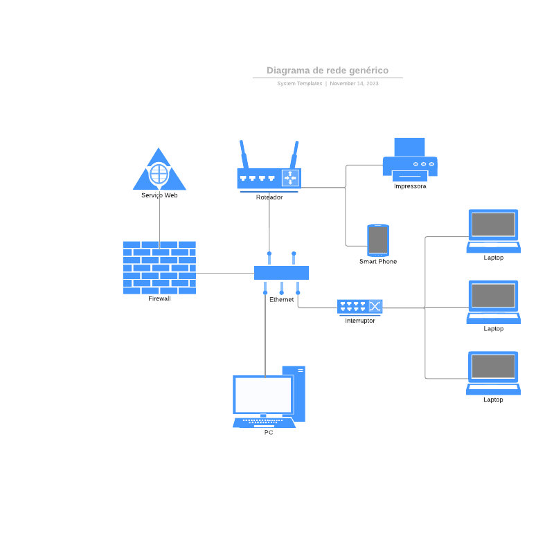 Arraste e solte ícones padrão de rede e crie uma representação detalhada da sua rede. Rotule todos os componentes do seu diagrama para facilitar a compreensão de todos.
