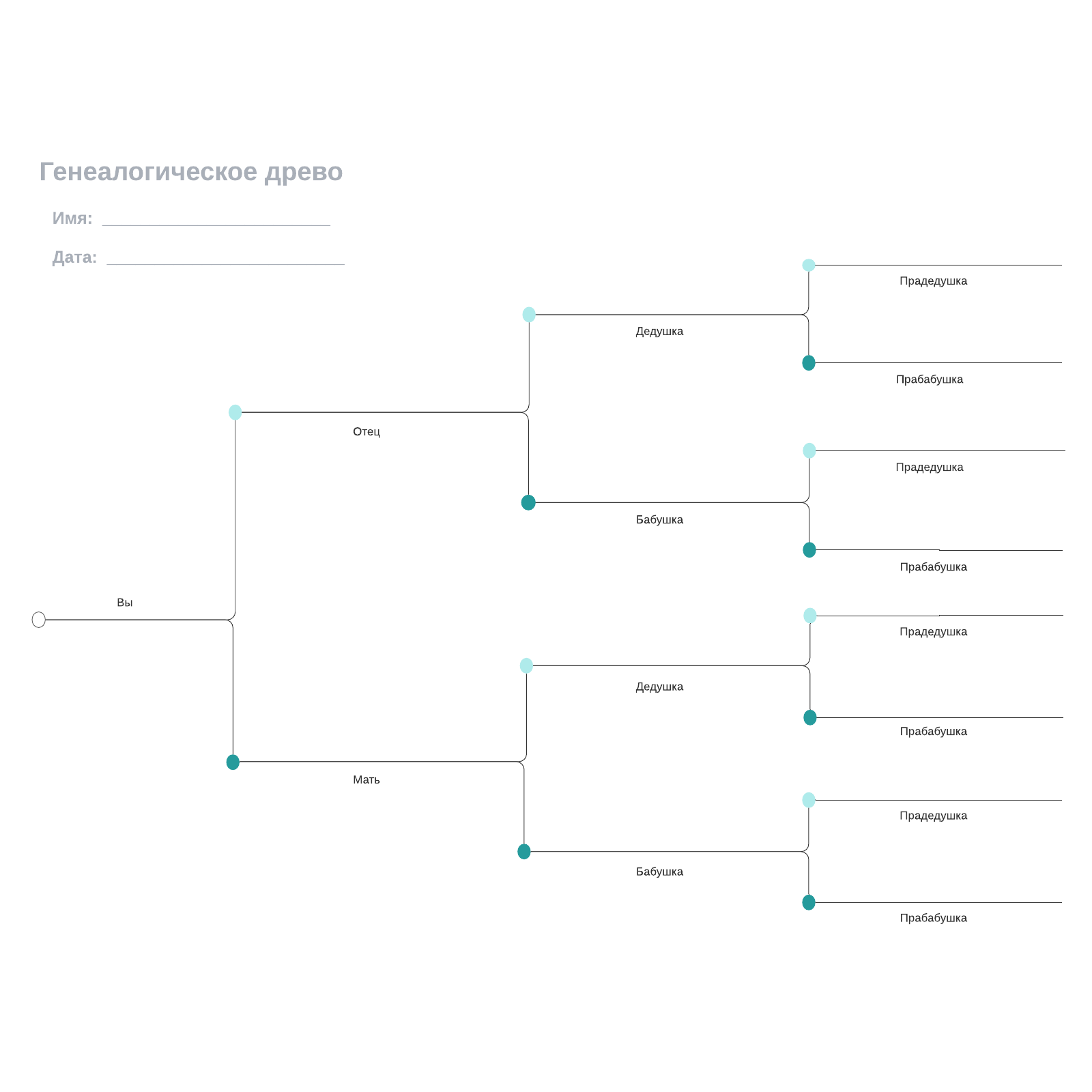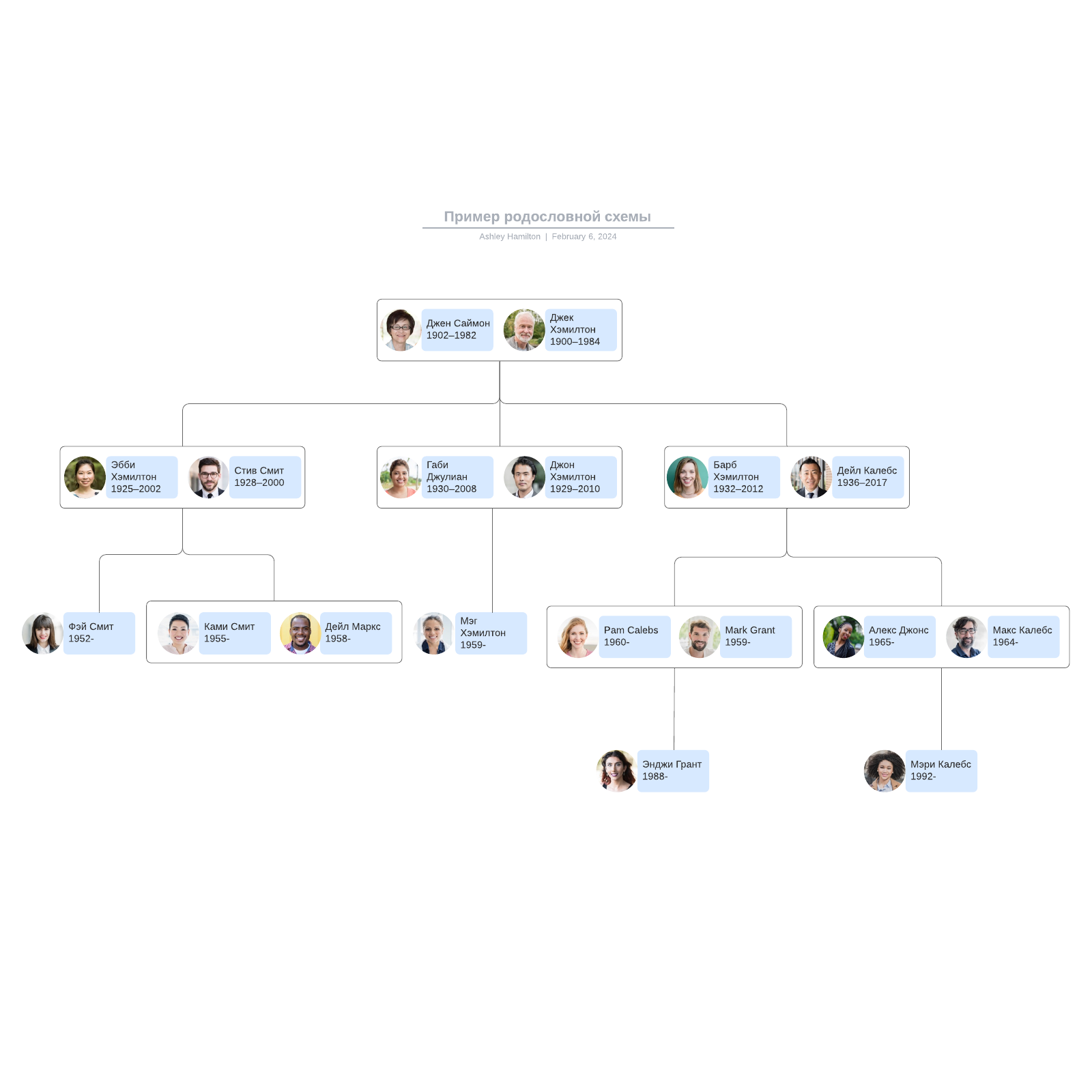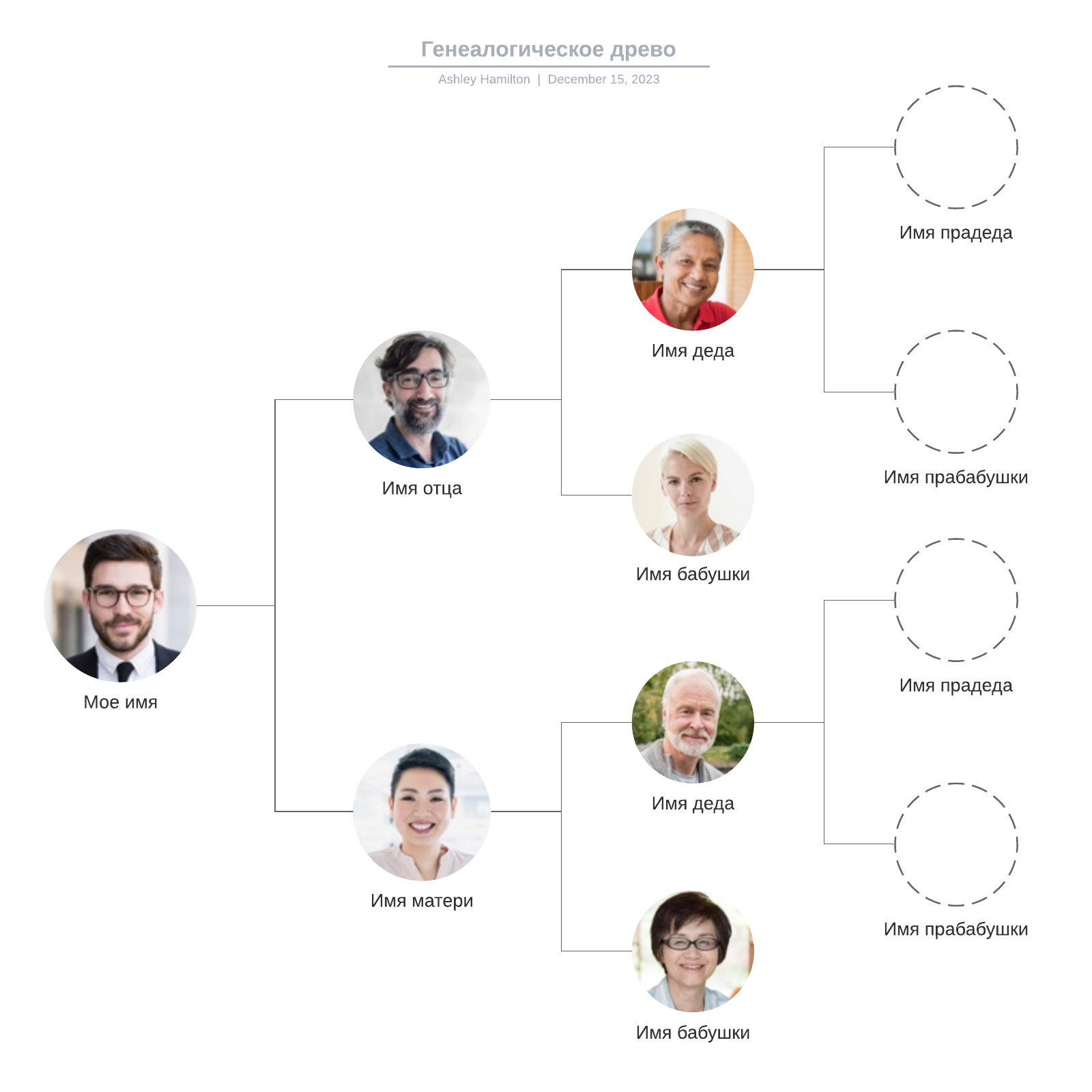 Генеалогическое древо — это наглядная схема родословной человека, по которой можно проследить связи разных членов семьи с общими предками. Подобно органиграмме, эта схема имеет древовидную структуру, которая «растет» от одного человека у корня. Ветви изображаются в виде линий, на конце которых находятся блоки, то есть листья. Каждый лист символизирует отдельного члена семьи и содержит краткую информацию о нем, например, даты рождения, заключения брака и смерти. Генеалогическое (или семейное) древо — удобный формат для записи имен, мест и событий, из которых соткана история семьи, а также отличная схема, которой можно поделиться с другими.