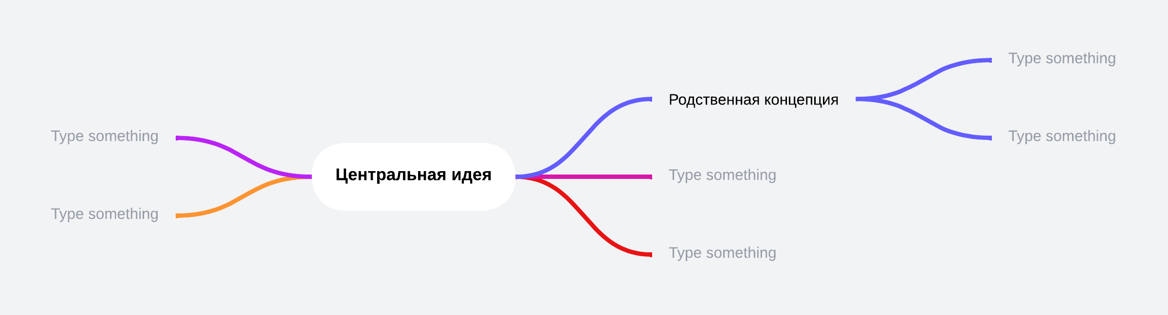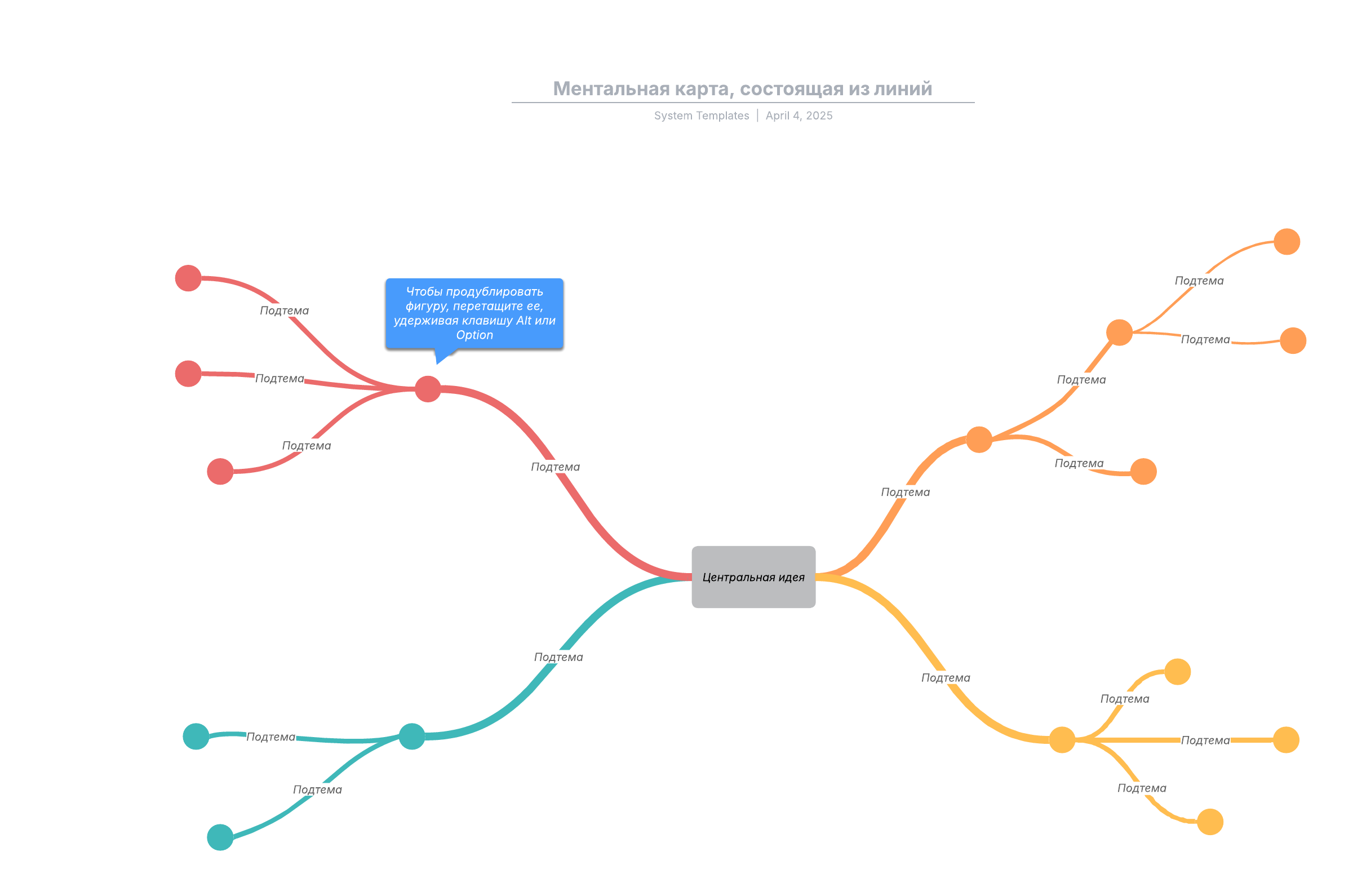 Центральная идея — это главная тема вашего мозгового штурма, например, проблема на повестке дня или цель предстоящего проекта. Перетащите на доску нужную вам фигуру из библиотеки для ментальных карт и запишите на ней основную идею. Эта фигура останется в центре по мере роста карты.