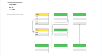 Skapa ER-diagram enklare genom att använda mallar och dedikerade formbibliotek för att dra och släppa standardiserade ERD-symboler. Det gör att du kan bygga fysiska och konceptuella enhetsrelationsdiagram på några minuter. Inkludera tabeller, fält och primära eller främmande nycklar, anslut sedan varje entitet med specifika kråkfotsnotationer för att indikera kardinalitet eller ordinalitet för varje enhet.