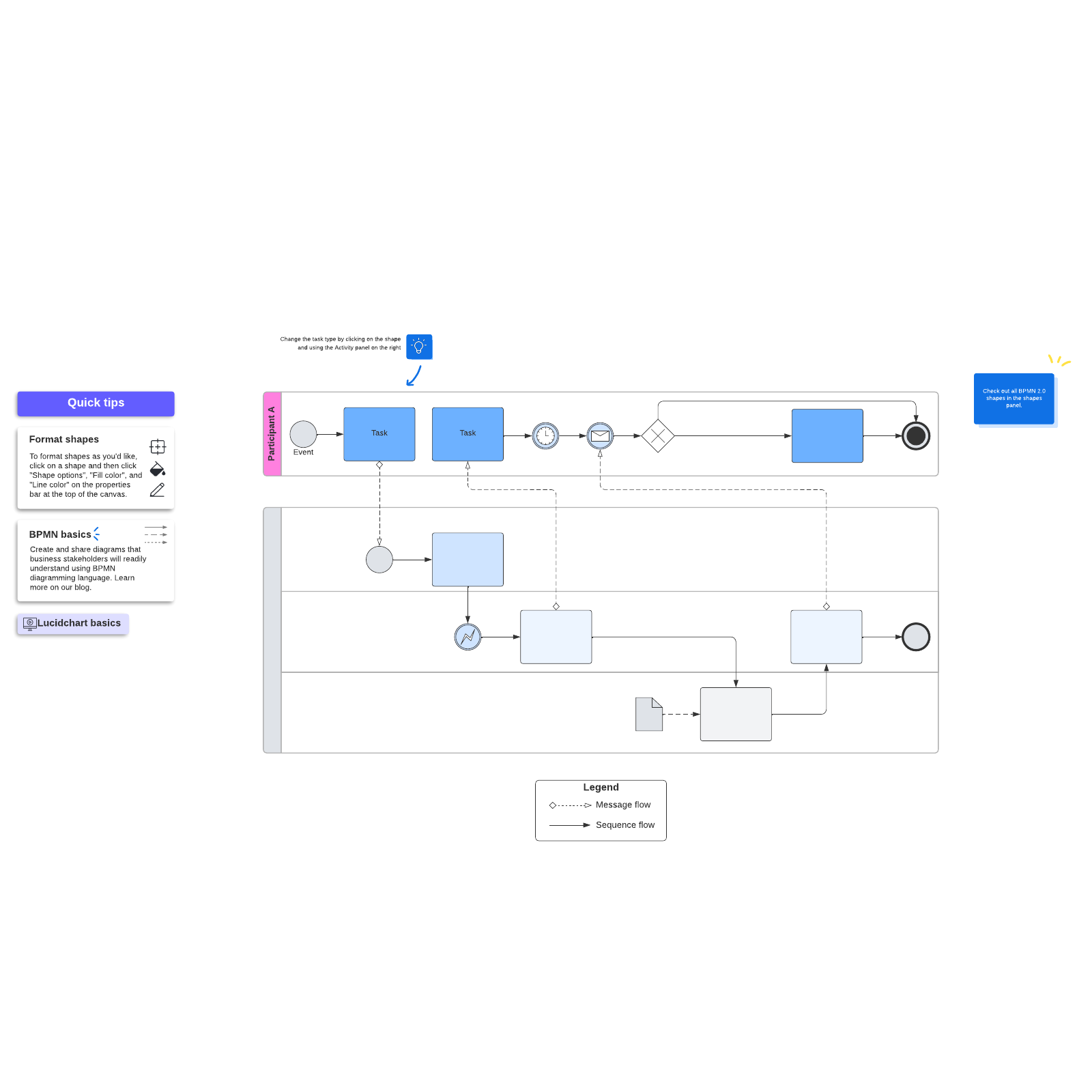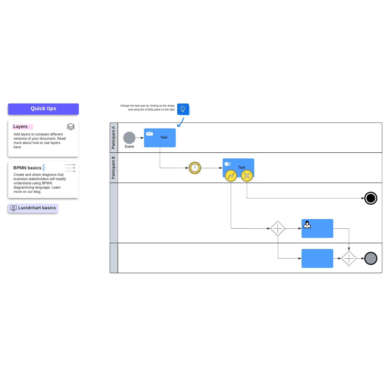 AnvÀnd inbyggda eller anpassade formbibliotek för att enkelt skapa BPMN-diagram. Samarbeta mellan team för att kartlÀgga, förstÄ och förbÀttra alla processer.