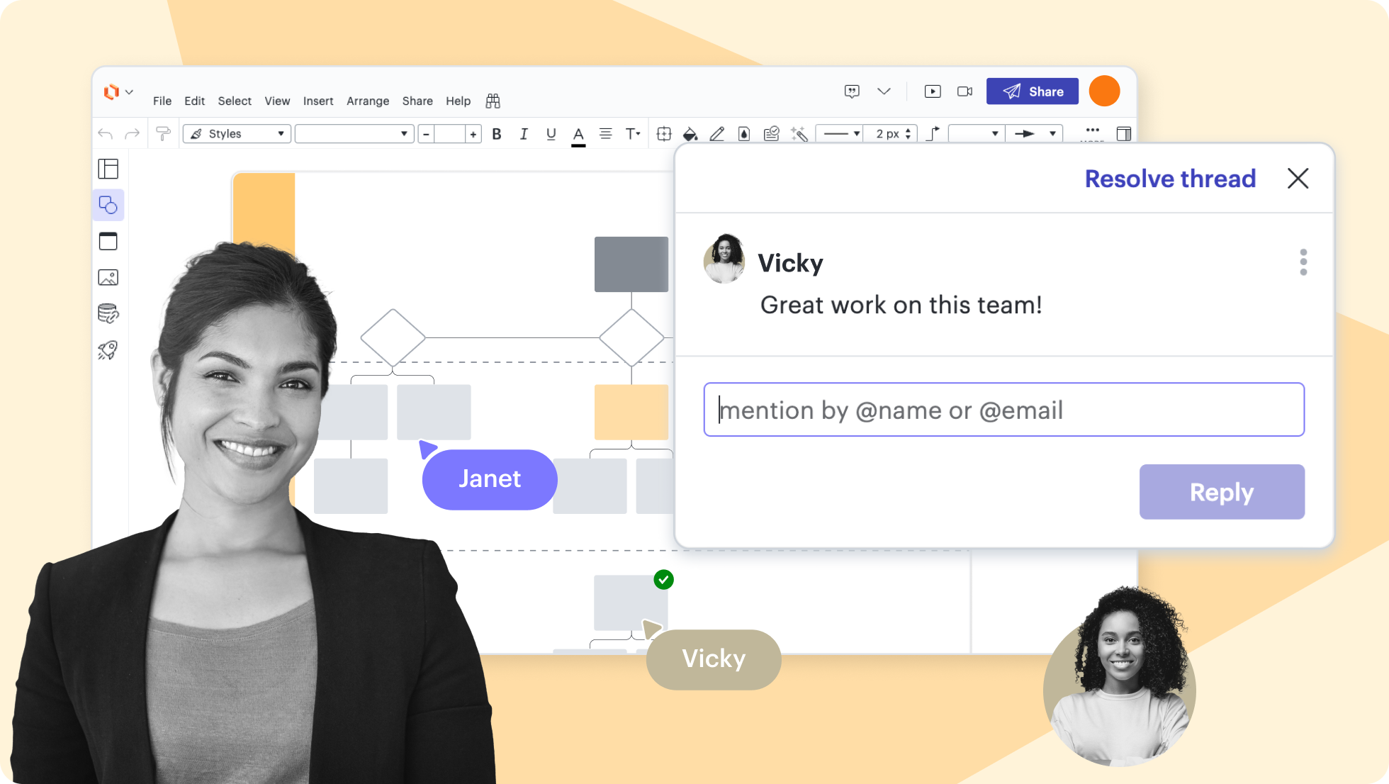 Invite people to view, edit, or give real-time feedback on your flowchart using comments and @mentions. Enable collaborator colors to see who contributed what, and use revision history to view changes or revert to a previous version.