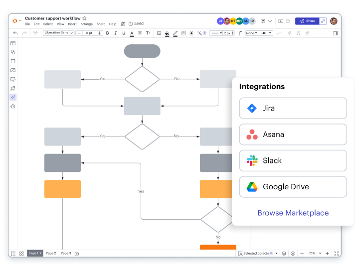 Connect Lucidchart to apps from leading providers like Google, Microsoft, and Slack. Explore the Lucid integrations marketplace for apps to streamline communication, strategic planning, task management, and more.