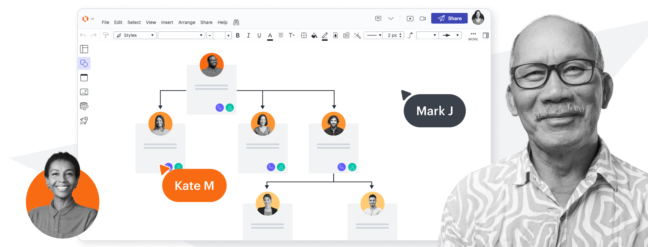 Import your BambooHR data to generate org charts, and use smart org chart shapes to connect direct reports.